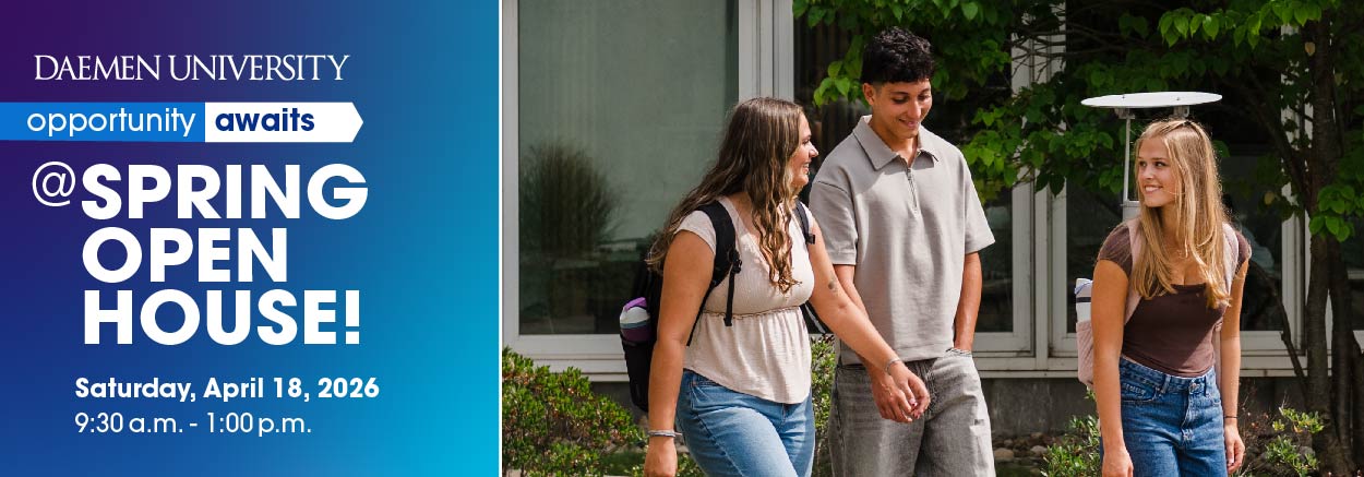 Spring Open House 2026Saturday, April 18, 2026 at 9:30 AM until 1:00 PMEastern Daylight Time UTC -04:00Map and DirectionsDaemen University4380 Main StBuffalo, NY 14226United StatesLoading...*Required FieldStudent's Personal Information*Student's First Name:*Student's Preferred First Name:*Last Name:*Birthdate:*Birthdate:JanuaryFebruaryMarchAprilMayJuneJulyAugustSeptemberOctoberNovemberDecember123456789101112131415161718192021222324252627282930312026202520242023202220212020201920182017201620152014201320122011201020092008200720062005200420032002200120001999199819971996199519941993199219911990198919881987198619851984198319821981198019791978197719761975197419731972197119701969196819671966196519641963196219611960195919581957195619551954195319521951195019491948194719461945194419431942194119401939193819371936193519341933193219311930192919281927192619251924192319221921192019191918191719161915191419131912191119101909190819071906190519041903190219011900Gender:FemaleMaleGender Identity:Are you a veteran:YesNoAcademic Information*You will enter as a:First YearTransfer*When will you enter:Summer 2026Fall 2026Spring 2027Summer 2027Fall 2027Spring 2028Summer 2028Fall 2028Spring 2029Summer 2029Fall 2029Spring 2030Summer 2030Fall 2030*What is your program of interest?AccountingAdolescence Ed: BiologyAdolescence Ed: EnglishAdolescence Ed: MathematicsAdolescence Ed: Social StudiesAnimationArtArt - Graphic DesignArt - IllustrationArt - Visual Arts Education (PK-12)Arts ManagementBiochemistryBiology - Cytology TrackBiology - Environmental StudiesBiology, BABiology, BSBusiness Administration - General BusinessBusiness Administration - Human Resource ManagementBusiness Administration - Human Resource Management CertificationBusiness Administration - Operations and Supply Chain ManagementBusiness Administration - Social EntrepreneurshipBusiness Administration - Sport ManagementChildhood EducationCriminal Justice BSEarly Childhood/Special EducationEducation Students with DisabilitiesEducational StudiesEnglishEnglish - Pre-LawEnglish - Professional Writing and RhetoricHealth Promotion - Community HealthHealth Promotion - Community Health/Public Health BS/MPHHealth Promotion - Health and Fitness TrainingHealth, Wellness, and Fitness ManagementHistoryHistory and Political ScienceHistory and Political Science - Environmental StudiesHistory and Political Science - Pre-LawInclusive Childhood (1-6)/Students with Disabilities (all ages)MarketingMathematicsNatural Science - Environmental StudiesNatural Science - ForensicsNatural Science - Health Science Sp/Public Health BSNatural Science - Health SciencesNursingNursing - Genesee Community CollegeNursing - SUNY ErieNursing - SUNY NiagaraPhysical TherapyPhysician AssistantPolitical Science - Pre-LawPolitical Science, BAPolitical Science, BSPre-DentistryPre-MedicinePre-PharmacyPre-Pharmacy 3+4 Suny UB PartnershipPre-VeterinaryPre-Veterinary - 3+4 Lincoln Memorial University PartnershipPsychology, BAPsychology, BSReligious StudiesSocial WorkStrategic Communications/Community Health PromotionStrategic Communications/English StudiesStrategic Communications/Graphic Design & MarketingStrategic Communications/Political CommunicationsStudio Arts, BFAUndeclared (Still Deciding)* What is your program of interest?AccountingAccounting CertificationAdolescence Ed: BiologyAdolescence Ed: EnglishAdolescence Ed: MathematicsAdolescence Ed: Social StudiesAnimationArtArt - Graphic DesignArt - IllustrationArt - Visual Arts Education (PK-12)Arts ManagementBiochemistryBiology - Cytology TrackBiology - Environmental StudiesBiology, BABiology, BSBusiness Administration - General BusinessBusiness Administration - Human Resource ManagementBusiness Administration - Human Resource Management CertificationBusiness Administration - Operations and Supply Chain ManagementBusiness Administration - Social EntrepreneurshipBusiness Administration - Sport ManagementChildhood EducationCriminal Justice BSEarly Childhood/Special EducationEducation Students with DisabilitiesEducational StudiesEnglishEnglish - Pre-LawEnglish - Professional Writing and RhetoricHealth Promotion - Community HealthHealth Promotion - Community Health/Public Health BS/MPHHealth Promotion - Health and Fitness TrainingHealth, Wellness, and Fitness ManagementHistoryHistory and Political ScienceHistory and Political Science - Environmental StudiesHistory and Political Science - Pre-LawInclusive Childhood (1-6)/Students with Disabilities (all ages)MarketingMathematicsNatural Science - Environmental StudiesNatural Science - ForensicsNatural Science - Health Science Sp/Public Health BSNatural Science - Health SciencesNursing RN - BS - OnlineNursing RN to BSNursing RN to MSParalegal Studies CertificateParalegal Studies Online CertificatePhysical TherapyPolitical Science - Pre-LawPolitical Science, BAPolitical Science, BSPre-DentistryPre-MedicinePre-PharmacyPre-Pharmacy 3+4 Suny UB PartnershipPre-VeterinaryPre-Veterinary - 3+4 Lincoln Memorial University PartnershipPsychology, BAPsychology, BSReligious StudiesSocial WorkStrategic Communications/Community Health PromotionStrategic Communications/English StudiesStrategic Communications/Graphic Design & MarketingStrategic Communications/Political CommunicationsStudio Arts, BFAUndeclared (Still Deciding)*Current school (or last school attended):School ceeb codeStudent's Contact InformationPhone:Mobile Phone:*Email Address:*Mailing Address:*Mailing Address:CountryStreetCityRegionPostal CodeParent InformationParent First Name:Parent Last Name:Parent Email:Event Guest(s)*Will you be bringing a guest (limit 2 guests per student)?012Disability Accommodations*Do you have a disability that requires accommodations to participate in Open House?YesNoPrefer not to sayIf yes, please describe the nature of the accommodation you will need:By attending this event, I understand that photos/videos of me and my guests may be used in publications, social media, and/or videos.Submit